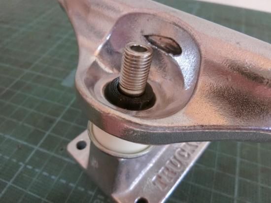 インサートブッシュはトラックベースプレートから飛び出しているキングピンとハンガーのキングピンが通る穴にジャストフィットする形状です。ターン、カービング、スライドの際にトラックがキングピンを軸にして倒れる(曲がる)用にするパーツです。インサートがないと遊びがあり反応が鈍くなります。実際にクルージング等ではインサートブッシュが必要ないと言えますがスラロームのようなターンの連続となると機敏に正確に反応してくれるインサートブッシュ入りがお勧め。ダウンヒルもトラックの遊びがない分安定性が増し、サクッとスライドも入ります。またターン、カービングやスライドが既にできていてスケートボードにしっかりと乗れているスケーターにはターン、カービングやスライドの精度を高めるためのインサートブッシュとなります。