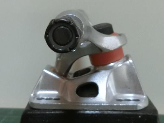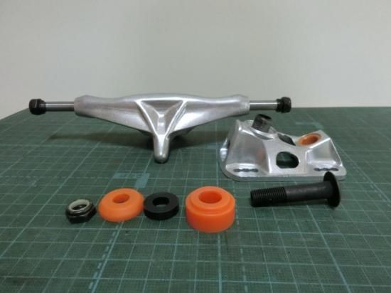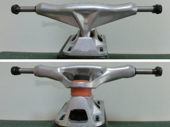 特徴的な形状のハンガーはグラインド時の安定感とホールド性を体感できる。ホローキングピンとベースプレート部分の大幅な切り出しは圧倒的な軽量化を実現。ビスホールを3つにし三段階のホイールベースチェンジが可能。搭載されたブッシュはTRI-KUSH BUSHINGS SYSTEM。トップには硬さの異なるブッシュが二段になっていて4段階のセッティングが可能。細かい調整でブッシュを買い替えることなく自分好みのセッティングが出来る。